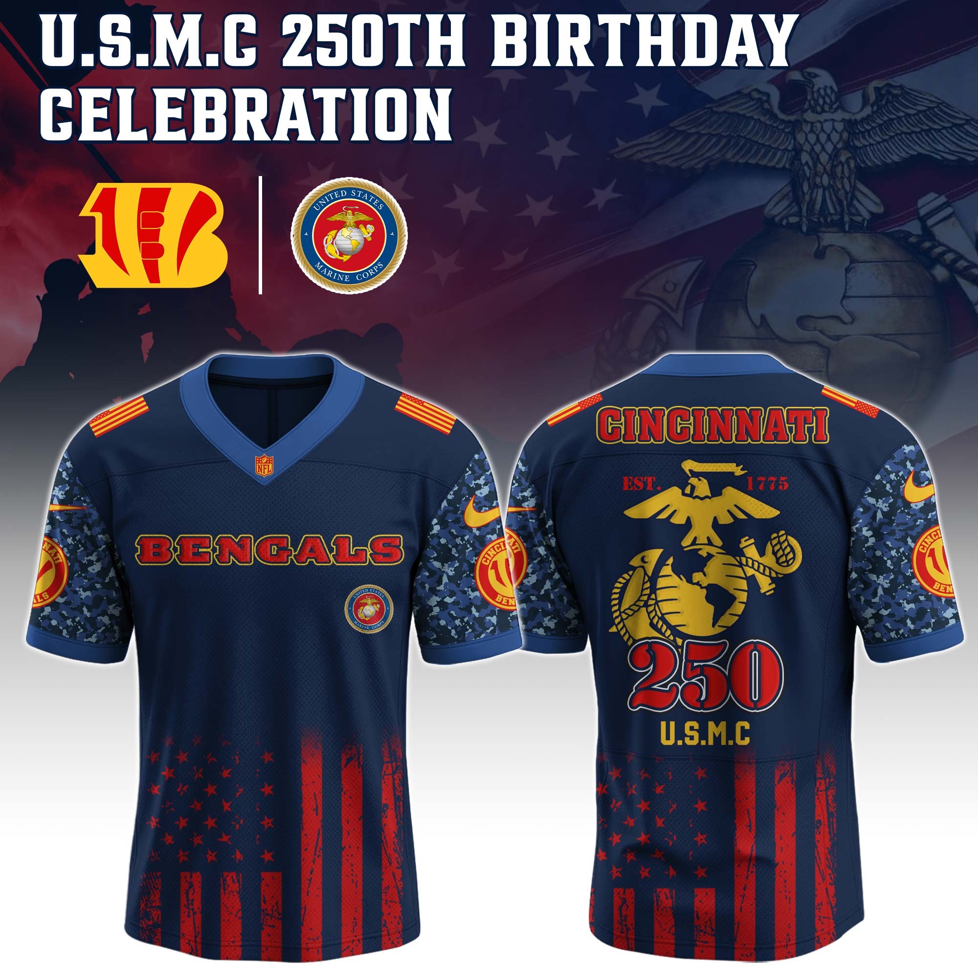 Cincinnati Bengals x 250 Years Anniversary US Marine Corps U.S.M.C Special Edition NFL Jersey