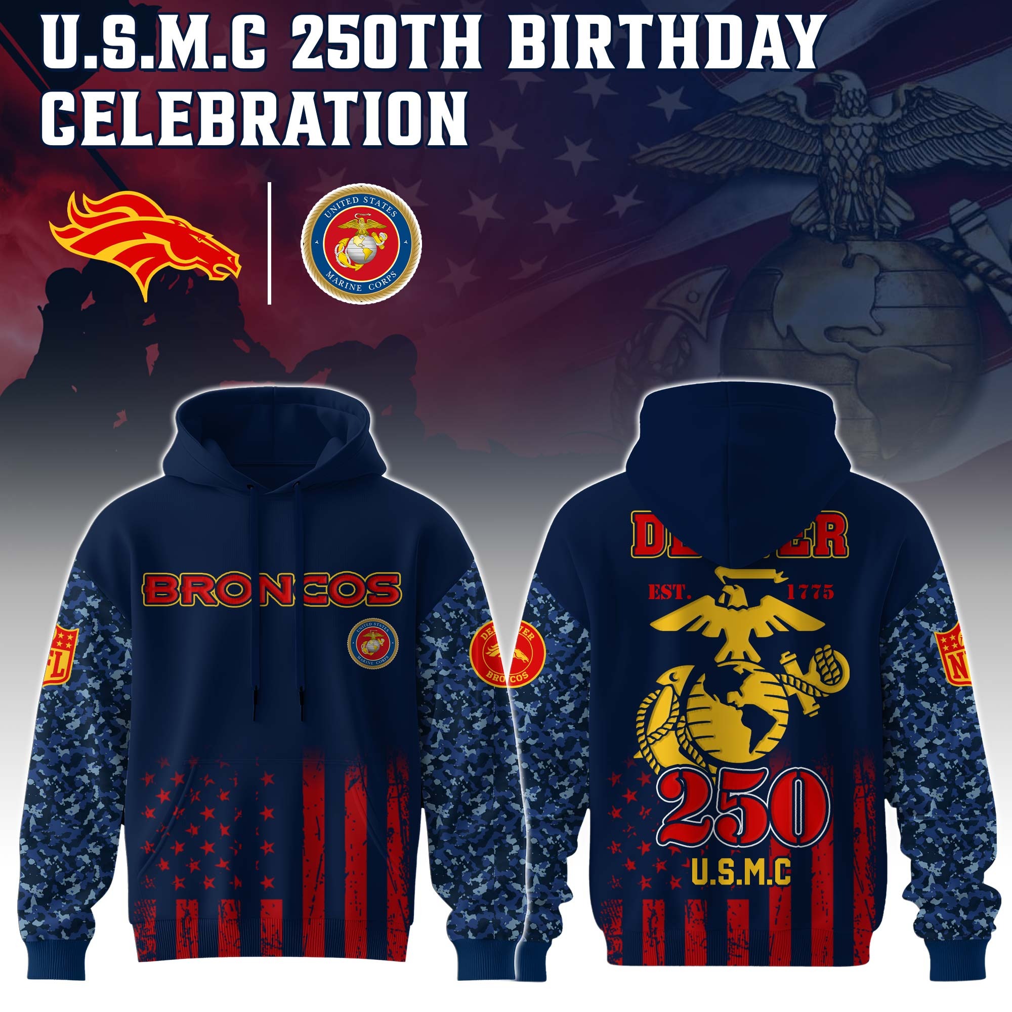 Denver Broncos x 250 Years Anniversary US Marine Corps U.S.M.C Special Edition Unisex Hoodie