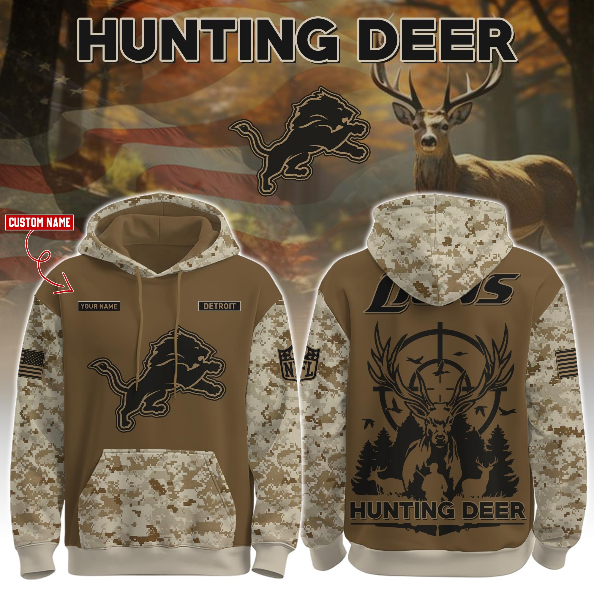 Detroit Lions x Deer Hunter Personalized Custom Unisex Hoodie